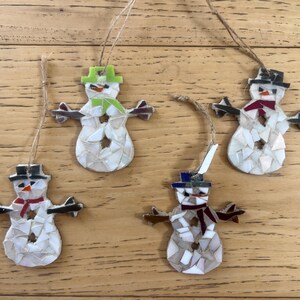 Hand Made Mosaic Glass Ornaments. Each one is about 3 inches wide and 3 inches tall, they vary slightly depending on the shape. Each made with small pieces of glass on a wood base.